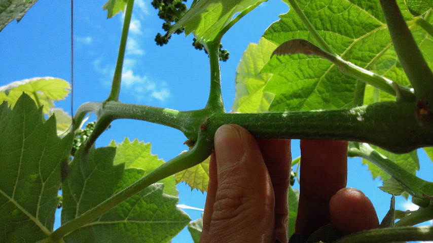 勢いよく伸びている枝を、全然違う方向へ曲げようとするので、力の入り方によってはポキっといってしまうのだ。折れた枝のブドウはその年当然収穫できないわけで、折ってしまった時のショックはけっこう大きい。